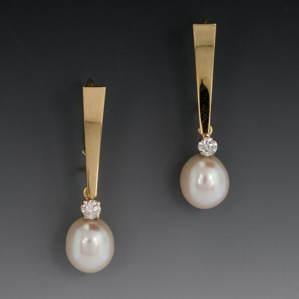 Earrings, Freshwater Pearl & Diamond Drop, 18K Yellow Gold